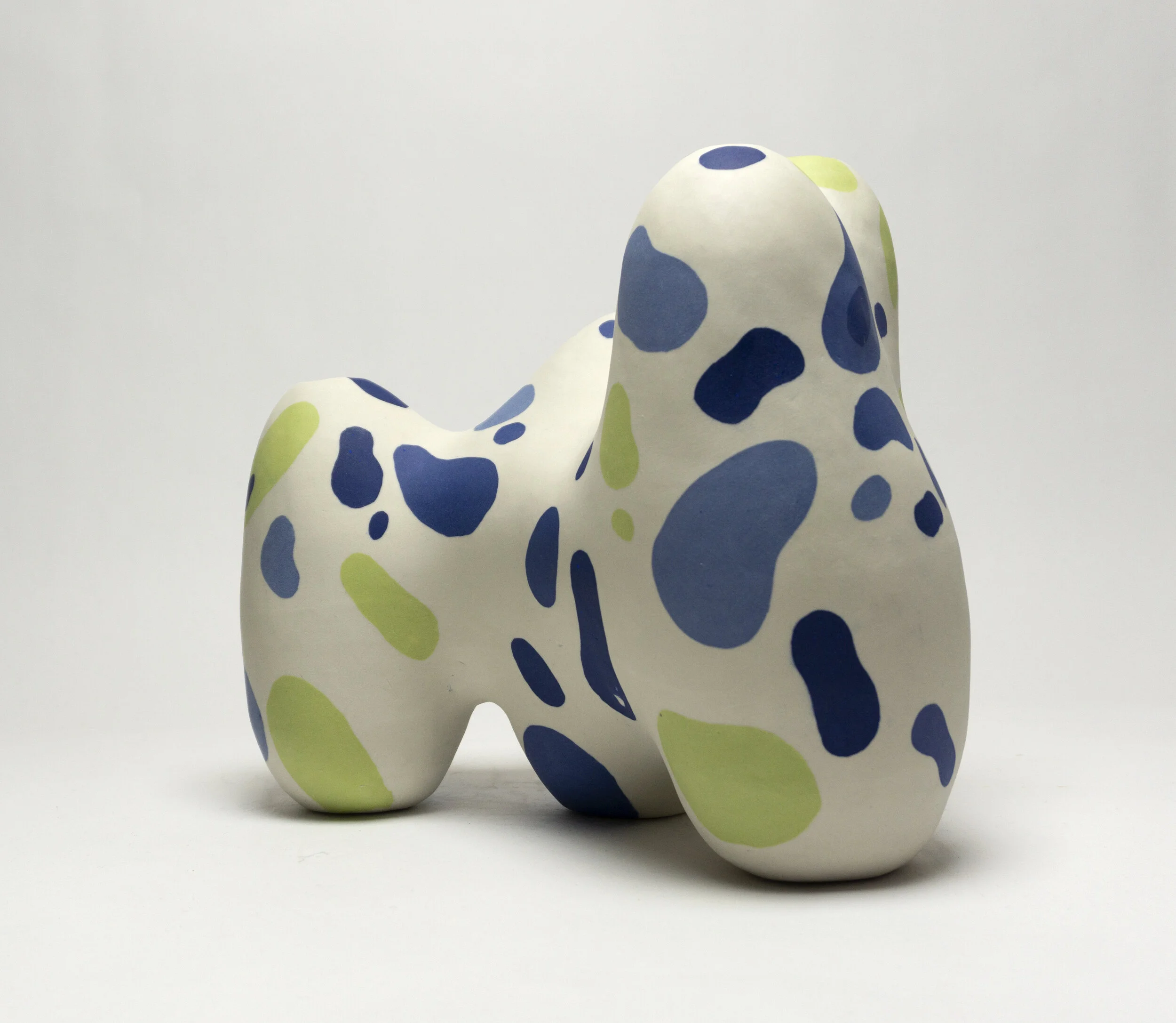 Sculpture in unglazed porcelain with colored spots, h. 12”